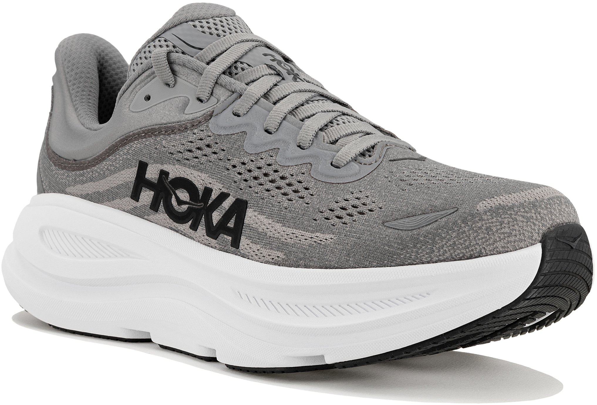 La chaussure Hoka Bondi 9 pour homme vous fait découvrir un niveau d’amorti et de confort inédit pour vos sorties de running quotidiennes.     Bondi 9, pour quel type de sportif, quel usage, quelle distance et surface ?   Adaptée à tous les niveaux, elle est conçue pour vous apporter des foulées plus confortables les unes que les autres durant vos sessions de course à pied sur les routes et chemins tracés. Elle vous accompagne sur toutes les distances et convient également pour vos journées de récupération et vos activités quotidiennes.     Bondi 9, quelle utilisation ?   + Idéale pour des séances de running à allure lente ou modérée, son amorti maximal promet une grande douceur ainsi qu’un rebond aérien à chaque pas. Vous appréciez également son confort pour vos longues journées de marche ou vos sessions de récupération.   – Si vous êtes à la recherche d’un modèle plus axé sur la performance et les compétitions, nous vous recommandons la Hoka Skyward X.     Pourquoi choisir la Bondi 9 ?   En adoptant cette chaussure, vous profitez : D’une absorption des chocs parfaite. D’un amorti moelleux et particulièrement confortable. De foulées fluides et aériennes. D’un ajustement précis et agréable du pied. D’une grande durabilité pour enchaîner les kilomètres.     Bondi 9, quelles nouveautés ?   En comparaison avec la version précédente, la Bondi 8, elle offre : Une nouvelle mousse en EVA et 2 mm supplémentaires de hauteur de stack pour un amorti des plus performants. Un nouveau col légèrement plus haut pour envelopper agréablement votre pied et protéger votre talon d’Achille. Une empeigne actualisée en mesh tricot avec des matériaux recyclés. Un nouveau drop de 5 mm.     Caractéristiques de la chaussure Bondi 9   Drop : 5 mm   Amorti : signature de la marque, sa mousse épaisse en EVA garantit un incroyable confort via son amorti moelleux. Sa géométrie favorise des transitions efficaces et naturelles.   Empeigne (partie supérieure qui enveloppe votre pied) : son mesh ventilé laisse l’air circuler pour une respirabilité adaptée à vos besoins. Le col moulé 3D s’étend sur le talon d’Achille pour un maintien optimal tandis que des détails réfléchissants améliorent votre visibilité.   Semelle extérieure : composée d’un caoutchouc durable, elle promet une grande résistance à l’abrasion et une adhérence fiable.   Semelle intérieure amovible  Poids constaté chez i-Run : 284 g en taille 42