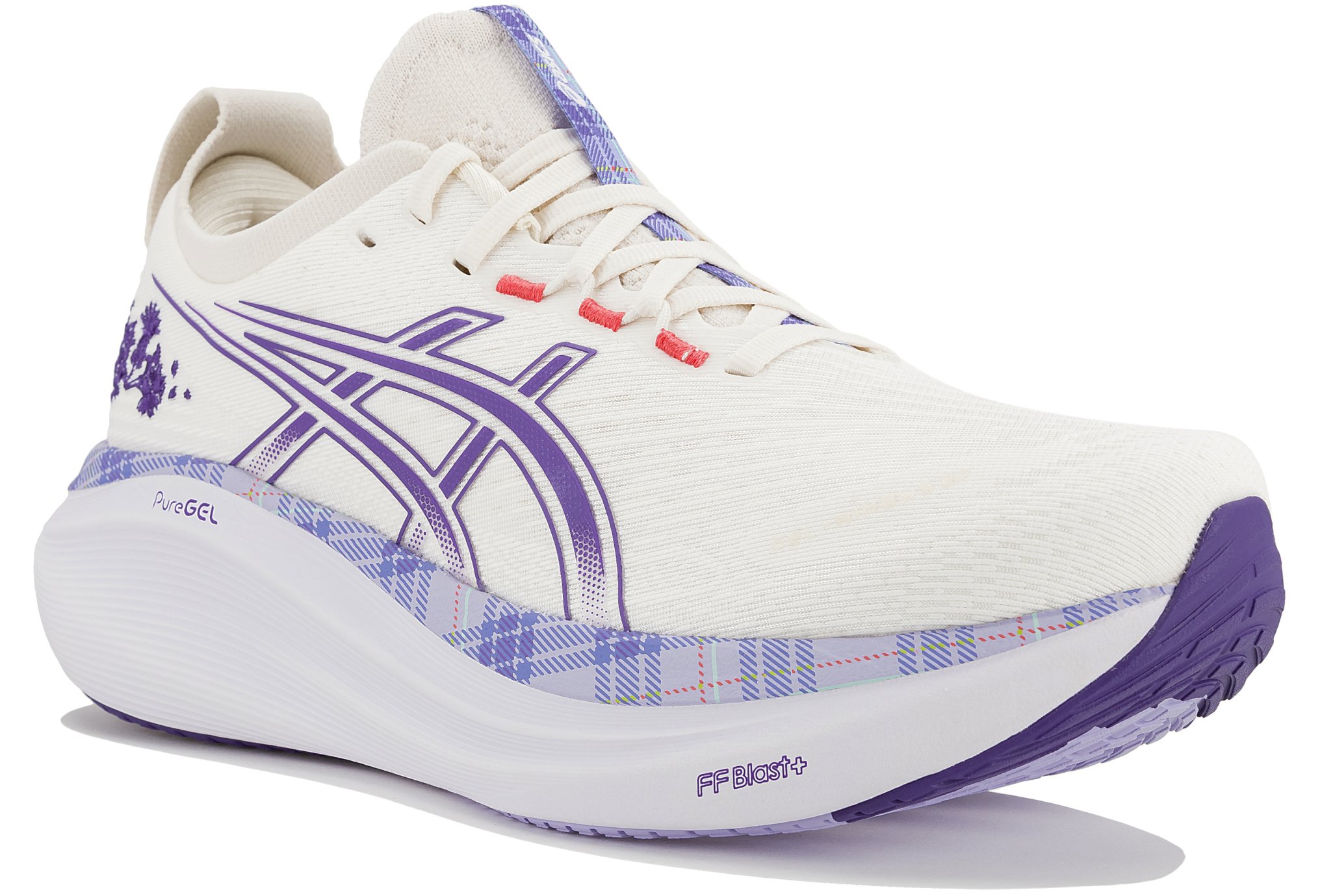 La chaussure Asics Gel-Nimbus 27 pour femme vous fait découvrir un nouveau niveau de confort lors de vos longues sorties de running. Gel-Nimbus 27, pour quel type de sportive, quel usage, quelle distance et surface ? Accessible à tous les niveaux de pratique, la Gel-Nimbus 27 est pensée pour les sessions de running quotidiennes à allure lente ou modérée. Son haut niveau de confort est idéal pour les longues distances sur les routes et les chemins tracés. Gel-Nimbus 27, quelle utilisation ? + Connu pour son amorti des plus confortables, ce modèle vous permet d’apprécier vos entraînements réguliers et intensifs sur de longues distances. Vous bénéficiez d’un maintien optimal et d’un rebond efficace pour enchaîner les kilomètres . – Si vous êtes à la recherche d’une chaussure pour vous entraîner avec des objectifs de vitesse, nous vous recommandons la Asics Novablast. Pourquoi choisir la Gel-Nimbus 27 ? Cette 27ème édition vous offre : Un niveau de confort inégalé pour courir avec aisance. Une grande durabilité à l’épreuve de nombreux kilomètres. Un maintien du pied optimisé et agréable. Des foulées fluides et efficaces. Gel-Nimbus 27, quelles nouveautés ? En comparaison avec la dernière version, la Gel-Nimbus 26, elle possède : 2 mm de stack supplémentaires au niveau de la semelle intermédiaire pour améliorer l’amorti, le confort et la réactivité. Une empeigne retravaillée avec un nouveau mesh pour un ajustement plus précis et une respirabilité maximale. Caractéristiques de la chaussure Gel-Nimbus 27 Drop : 8 mm Amorti : avec 2 mm de stack supplémentaire et sa capsule de PureGel au talon, la semelle intermédiaire offre une excellente absorption des chocs et des atterrissages doux. Sa mousse et sa géométrie favorisent le dynamisme et des transitions fluides. Empeigne (partie supérieure qui enveloppe votre pied) : revue pour perfectionner son confort, elle se compose d’un mesh technique respirant et d’un col enveloppant. L’ensemble maintient votre pied en place et promet une liberté de mouvement optimale. Semelle extérieure : son caoutchouc résistant garantit une adhérence infaillible sur les surfaces sèches ou mouillées. Semelle intérieure amovible Poids constaté chez i-Run : 262 g en taille 40 Édition limitée en collaboration avec l’athlète Eilish McColgan